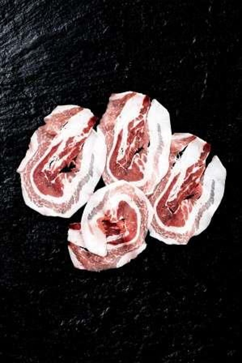 Pancetta arrotolata stagionata, prodotta con carne di suini nati ed allevati in Piemonte, nel nostro allevamento di Cossano Belbo.